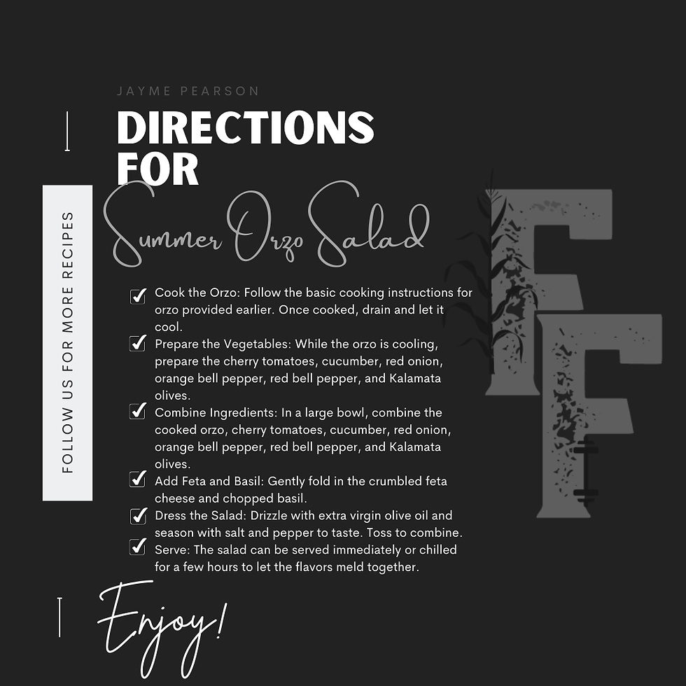 Summer Orzo SaladFarmFitMommaAug 7, 20241 min readUpdated: Sep 26, 2024This is absolutely my favorite summer salad! It’s light but full of flavors. I love using the tomatoes and cucumbers from my garden.